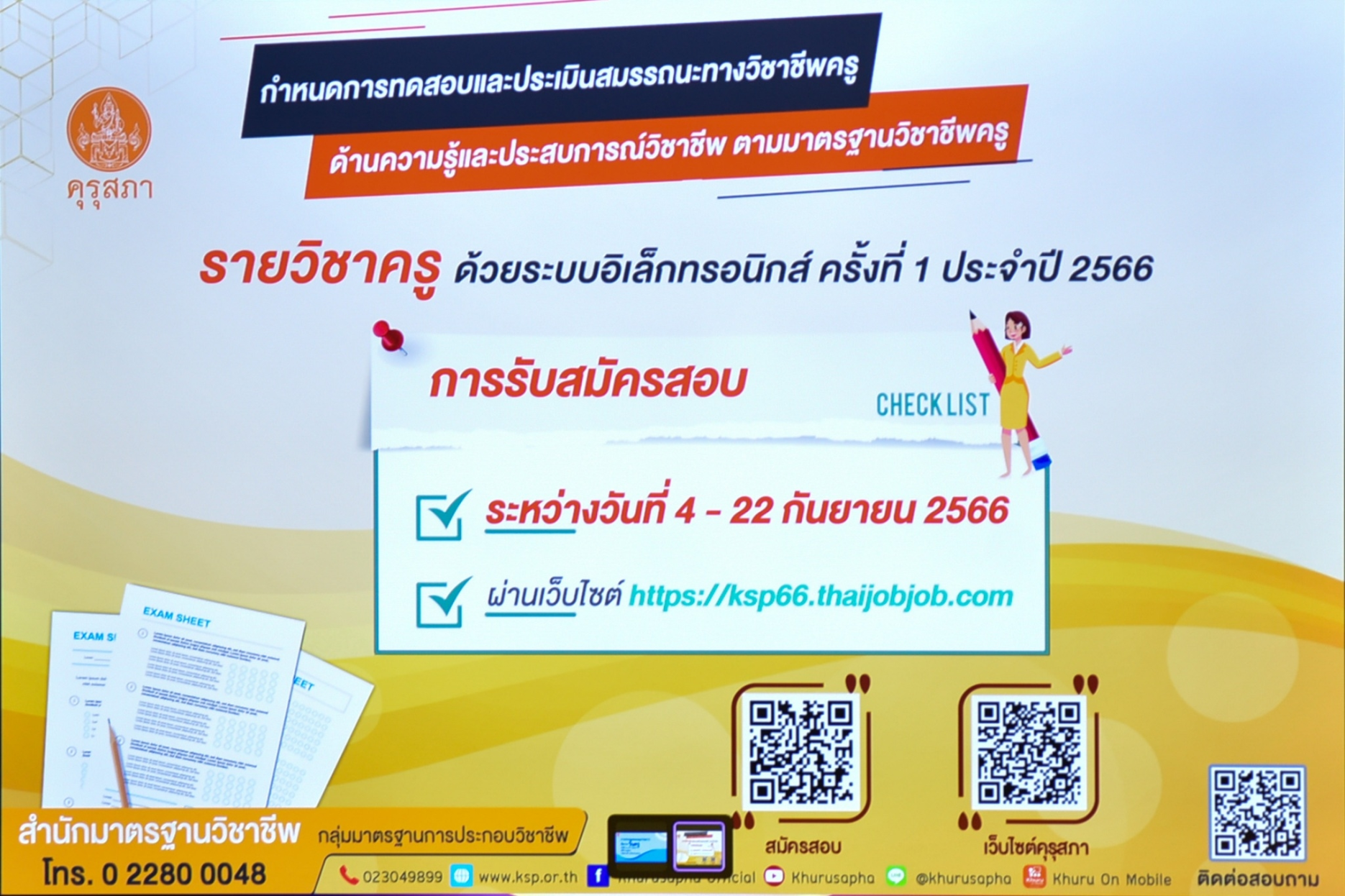 ด้าน ผศ.ดร.อมลวรรณ วีระธรรมโม เลขาธิการคุรุสภา กล่าวว่า การประกาศรับสมัครสอบครั้งนี้ เป็นครั้งแรกของการเปิดสอบในปี 2566 จำนวน 20,000 ที่นั่ง ซึ่งเป็นการสอบครั้งแรกด้วยระบบอิเล็กทรอนิกส์ของคุรุสภาในปี 2566 เพราะการสอบแบบประเภทกระดาษครั้งสุดท้ายจัดในปี 2565 โดยได้พัฒนาระบบสอบตามมาตรฐานสำนักงาน ก.พ. ซึ่งสำนักงานเลขาธิการคุรุสภาได้ทดสอบด้วยระบบอิเล็กทรอนิกส์ Computer Base ตามระบบของสำนักงาน ก.พ. ใช้ศูนย์สอบของสำนักงาน ก.พ. ทั้ง 5 ภูมิภาค โดยการสอบครั้งที่ 1/66 มีการจัดสอบจำนวน 4 รอบ