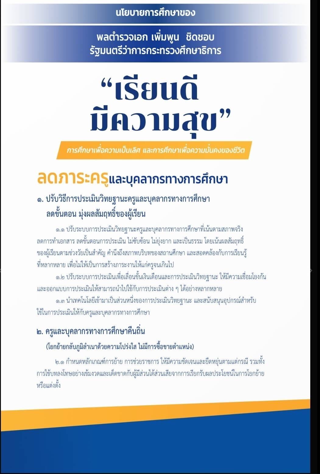 เมื่อวันที่ 14 กันยายน พล.ต.อ.เพิ่มพูน ชิดชอบ รัฐมนตรีว่าการกระทรวงศึกษาธิการ (ศธ.) กล่าวตอนหนึ่งในการประชุมมอบนโยบายการศึกษา และแนวทางการขับเคลื่อนนโยบาย “เรียนดี มีความสุข” โดยมีผู้บริหารศธ. และข้าราชการครูและบุคลากรทางการศึกษาทั่วประเทศ เข้าร่วมรับมอบนโยบาย ผ่านระบบวิดีโอคอนเฟอเรนซ์
