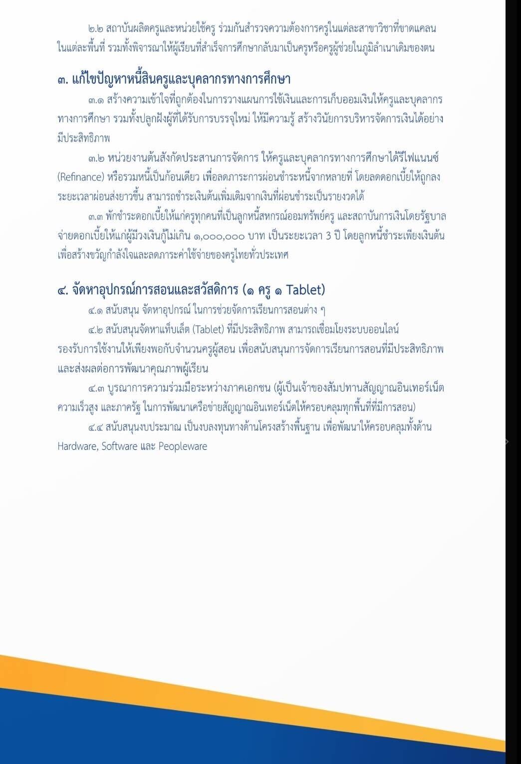3.แก้ไขปัญหาหนี้สินครูและบุคลากรทางการศึกษา สร้างความเข้าใจในการวางแผนการใช้เงิน หน่วยงานต้นสังกัด ประสานการจัดการให้ครูและบุคลากรทางการศึกษาได้รีไฟแนนซ์ หรือรวมหนี้เป็นก้อนเดียว เพื่อลดภาระการผ่อนชำระ โดยลดดอกเบี้ยให้ถูกลง ระยะเวลาผ่อนส่งยาวขึ้นพักชำระดอกเบี้ยให้แก่ครูและบุคลากรทางการศึกษา