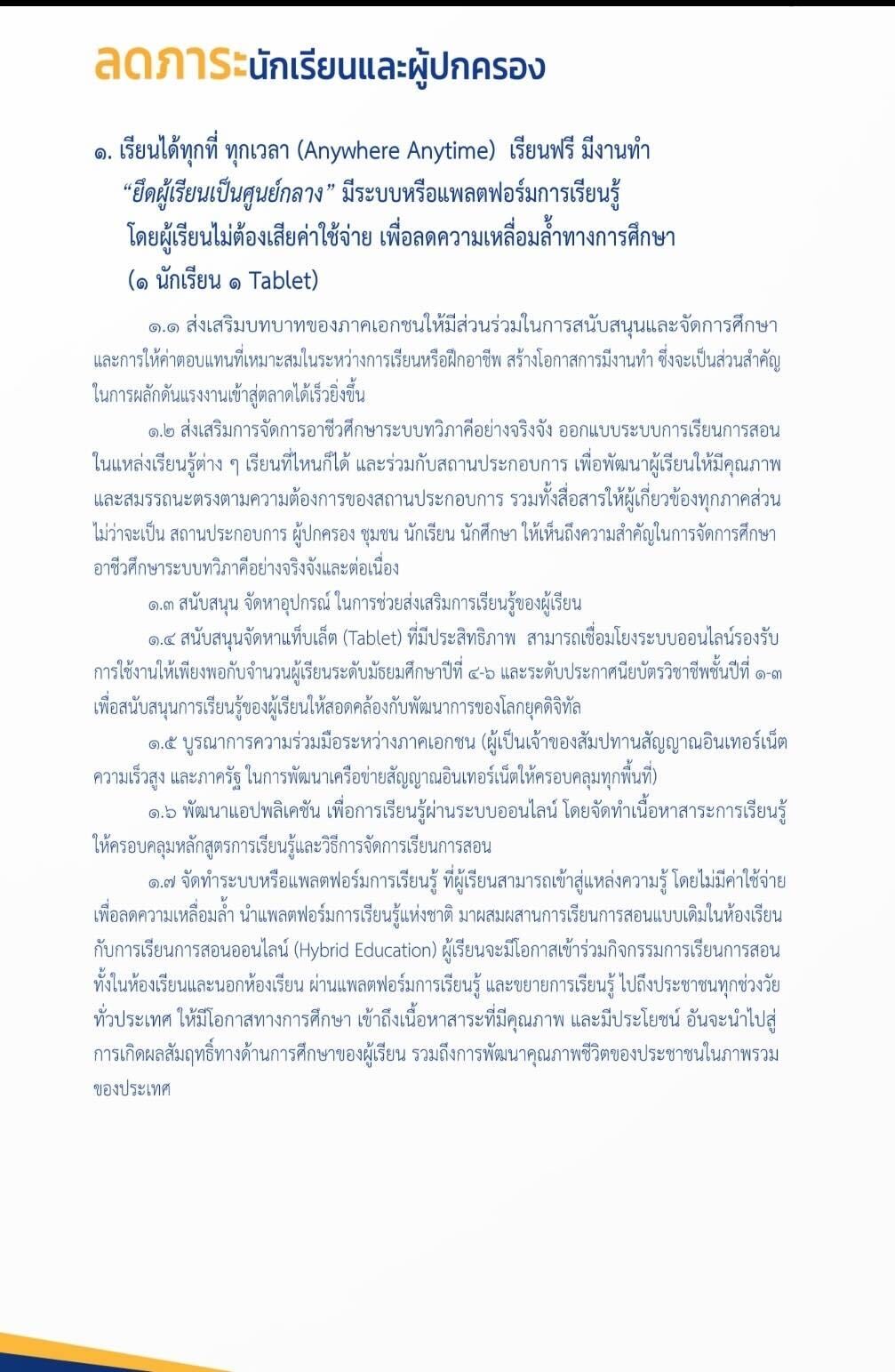 1.เรียนได้ทุกที่ ทุกเวลา (Anywhere Anytime) เรียนฟรี มีงานทำ “ยึดผู้เรียนเป็นศูนย์กลาง” มีระบบหรือแพลตฟอร์มการเรียนรู้ โดยผู้เรียนไม่ต้องเสียค่าใช้จ่าย เพื่อลดความเหลื่อมล้ำทางการศึกษา (1 ครู 1 Tablet)