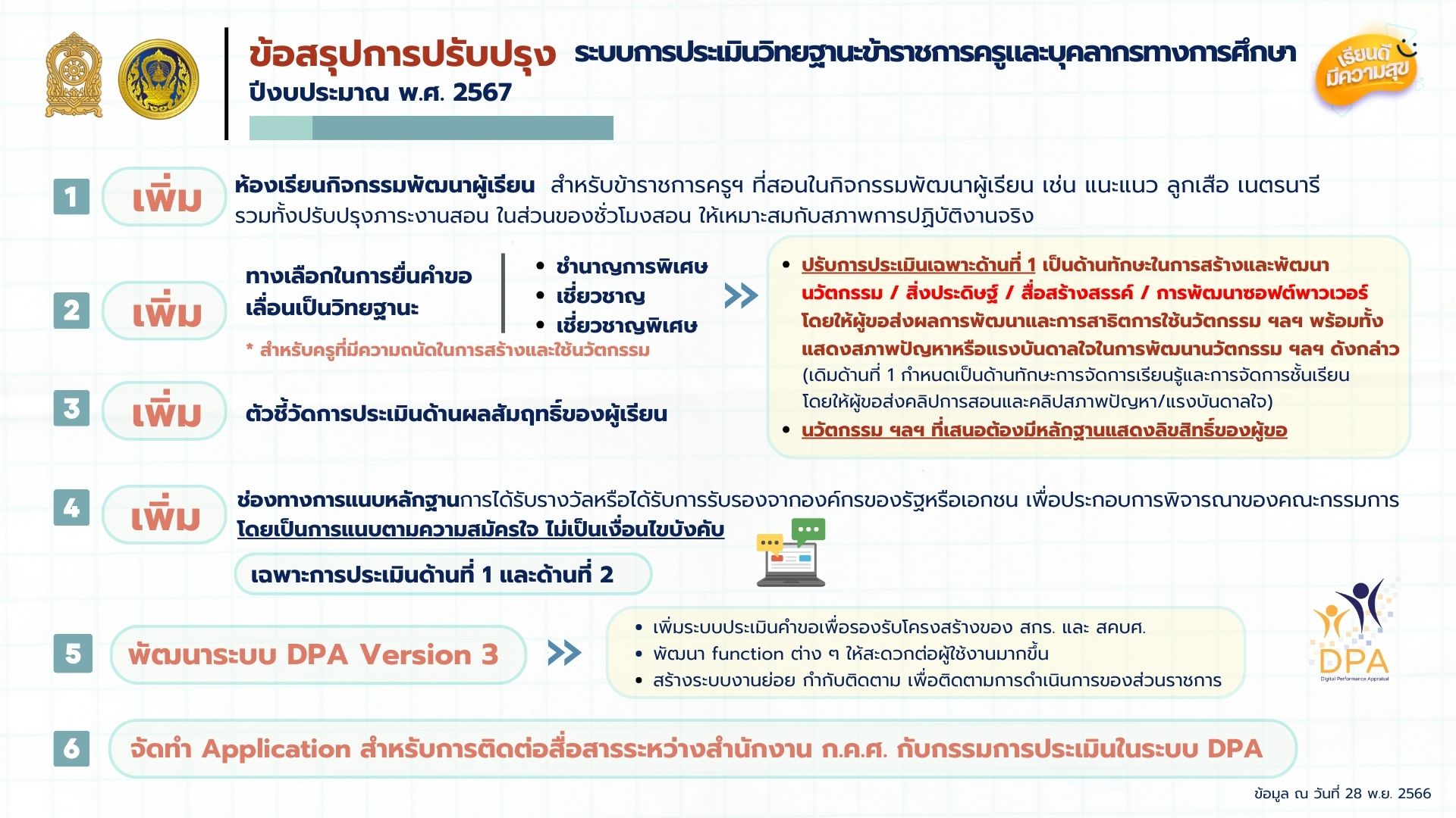 และขณะนี้สำนักงาน ก.ค.ศ. เร่งดำเนินการปรับปรุงระบบการประเมินฯ และปรับระบบ DPA ให้มีประสิทธิภาพมากยิ่งขึ้นเพื่อรองรับการดำเนินการทั้ง 6 ประเด็นดังกล่าวและจะแจ้งผลการดำเนินการให้ทุกท่านทราบเป็นระยะ ๆ ต่อไป