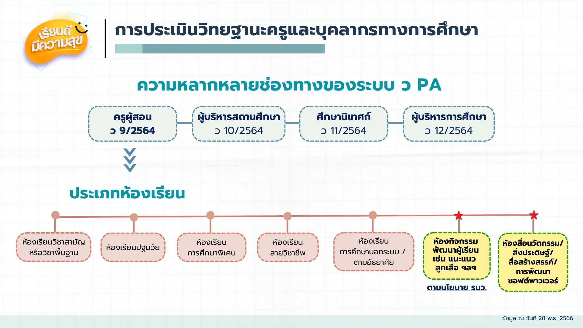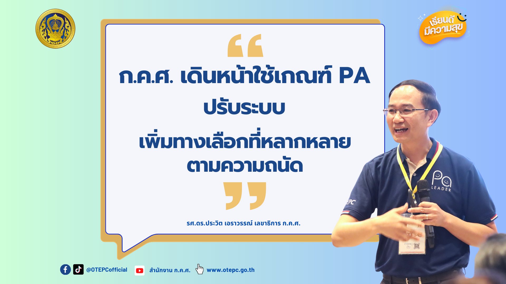 ก.ค.ศ. เดินหน้า 'ใช้เกณฑ์ PA' ปรับระบบ เพิ่มทางเลือกที่หลากหลายตามความถนัด ‘ประเมินครู’ เริ่มปี 2567 ชี้ให้ความสำคัญผลลัพธ์การเรียนรู้ของเด็กควบคู่วัดเทคนิควิธีการจัดการเรียนการสอนของครู