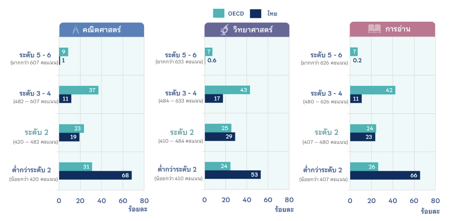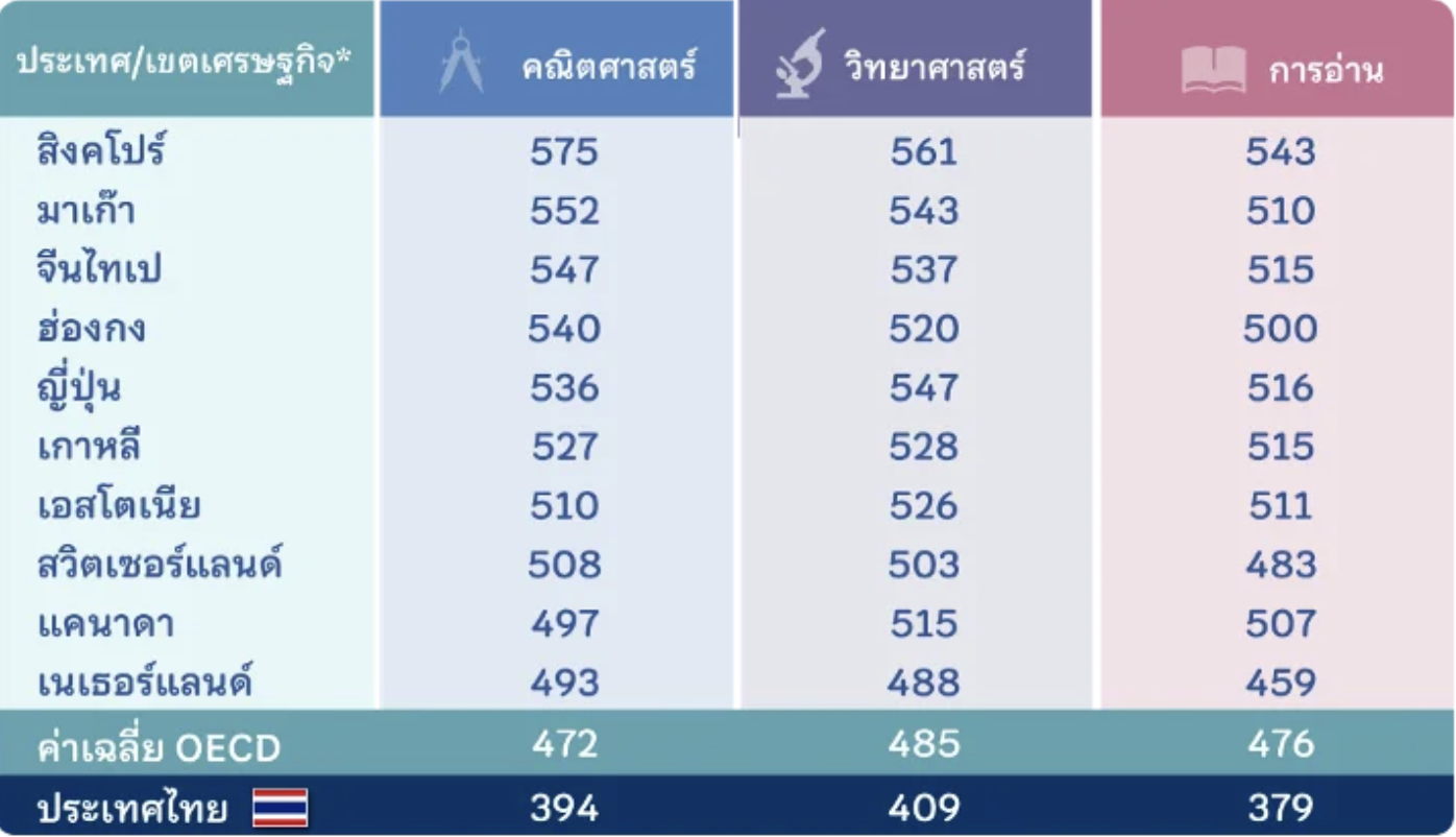 จาก 81 ประเทศ พบว่ามีเพียง 18 ประเทศ/เขตพื้นที่เท่านั้นที่มีคะแนนทั้ง 3 ด้านสูงเกินมาตรฐานขณะที่ประเทศไทยนั้นคะแนนต่ำกว่าค่าเฉลี่ยทุกทักษะรวมถึงคะแนนยังต่ำที่สุดในรอบ 20 ปีด้วย