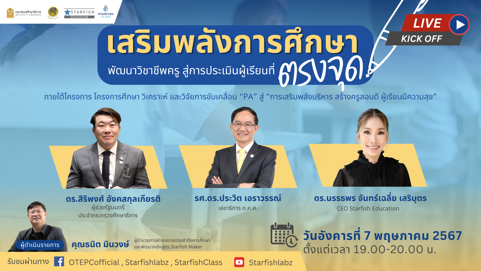 ในวันที่ 7 พฤษภาคม 2567 สำนักงานคณะกรรมการข้าราชการครูและบุคลากรทางการศึกษา (ก.ค.ศ.) ร่วมกับ มูลนิธิสตาร์ฟิช เอ็ดดูเคชั่น จัดกิจกรรม Kick Off รูปแบบ Live Special ใน หัวข้อ “เสริมพลังการศึกษา:พัฒนาวิชาชีพครู สู่การประเมินผู้เรียนที่ตรงจุด” ภายใต้โครงการศึกษา วิเคราะห์ และวิจัยการขับเคลื่อน “PA” สู่ “การเสริมพลังบริหาร สร้างครูสอนดี ผู้เรียนมีความสุข” โดยได้รับเกียรติจาก ดร.สิริพงศ์ อังคสกุลเกียรติ ผู้ช่วยรัฐมนตรีประจำกระทรวงศึกษาธิการ รศ.ดร.ประวิต เอราวรรณ์ เลขาธิการ ก.ค.ศ. และดร.นรรธพร จันทร์เฉลี่ย เสริบุตร ประธานเจ้าหน้าที่บริหาร Starfish Education มาร่วมแลกเปลี่ยนมุมมอง แนวคิดถึงการดำเนินงานที่สอดคล้องกับนโยบาย “เรียนดี มีความสุข” ในการลดภาระครู ปรับวิธีการประเมินวิทยฐานะและบุคลากรทางการศึกษา ลดขั้นตอน มุ่งผลสัมฤทธิ์ของผู้เรียน ยกระดับมาตรฐานการศึกษาและผลการประเมิน PISA และการวัดผลและประเมินผลการเรียนรู้