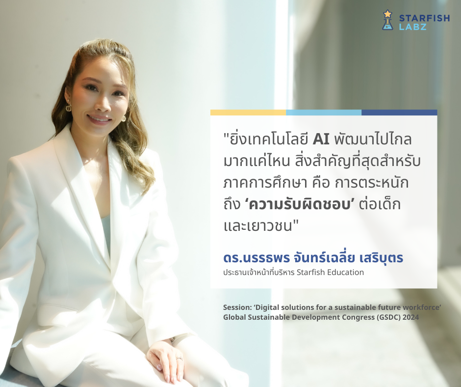 ดร.นรรธพร จันทร์เฉลี่ย เสริบุตร ได้รับเชิญเป็นวิทยากรร่วมแลกเปลี่ยนพูดคุยช่วงเสวนาในหัวข้อ "Digital solutions for a sustainable future workforce" ซึ่งได้ร่วมแบ่งปันวิสัยทัศน์และประสบการณ์ด้านการนำเทคโนโลยีดิจิทัลมาประยุกต์ใช้ในการยกระดับทักษะและเสริมสร้างศักยภาพของบุคลากรให้มีประสิทธิภาพสูงสุด โดย ดร.นรรธพร ได้กล่าวถึงการนำเทคโนโลยีปัญญาประดิษฐ์ (AI) มาใช้ในโลกปัจจุบันในหลายภาคส่วน ซึ่งผู้ผลิตเทคโนโลยีเองต้องให้ความสำคัญกับคุณภาพของ AI และผู้มีส่วนเกี่ยวข้องทุกภาคส่วนควรต้องตระหนักถึงความรับผิดชอบในการนำเทคโนโลยี AI มาใช้ ซึ่งจะส่งผลต่อเด็กและเยาวชนในภาคการศึกษา สำหรับจุดเน้นคือ การให้ความสำคัญกับทักษะทางสังคมและอารมณ์ควบคู่กับการใช้ AI ไปพร้อมกัน นอกจากนี้แล้วยังได้กล่าวถึงการนำ Microcredentials มาใช้เป็นระบบที่เอื้อให้กับผู้ที่สนใจการพัฒนาตนเอง สามารถนำมาใช้ให้เกิดประโยชน์ได้จริง ซึ่งเป็นสิ่งที่น่าสนใจมาก หากได้มีการผลักดัน Microcredentials ให้เกิดขึ้นในประเทศไทย จะส่งผลให้ผู้เรียนสามารถนำไปใช้ให้เกิดประโยชน์ได้จริง ไม่ว่าจะเป็นการนำไปใช้ประกอบการทำงานในภาคแรงงานอุตสาหกรรม และยังเป็นหนทางที่จะสร้างการเรียนรู้แบบ Live Long Learning ได้เป็นอย่างดี ซึ่งการทำงานของ Starfish Education เองได้มี Online Learning Platform (www.starfishlabz.com) สำหรับผู้ที่สนใจพัฒนาตนเอง โดยได้ออกแบบหลักสูตรให้กระชับ สามารถนำความรู้ที่เรียนไปใช้ได้ทันที ตอบโจทย์การพัฒนาตนเองแบบยุคใหม่ในปัจจุบันได้เป็นอย่างดีอีกด้วย