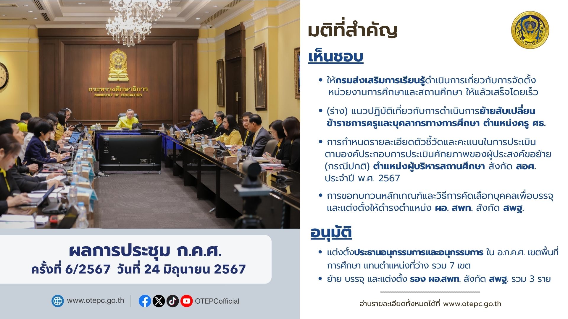 สรุปผลการประชุมคณะกรรมการข้าราชการครูและบุคลากรทางการศึกษา (ก.ค.ศ.) ครั้งที่ 6/2567