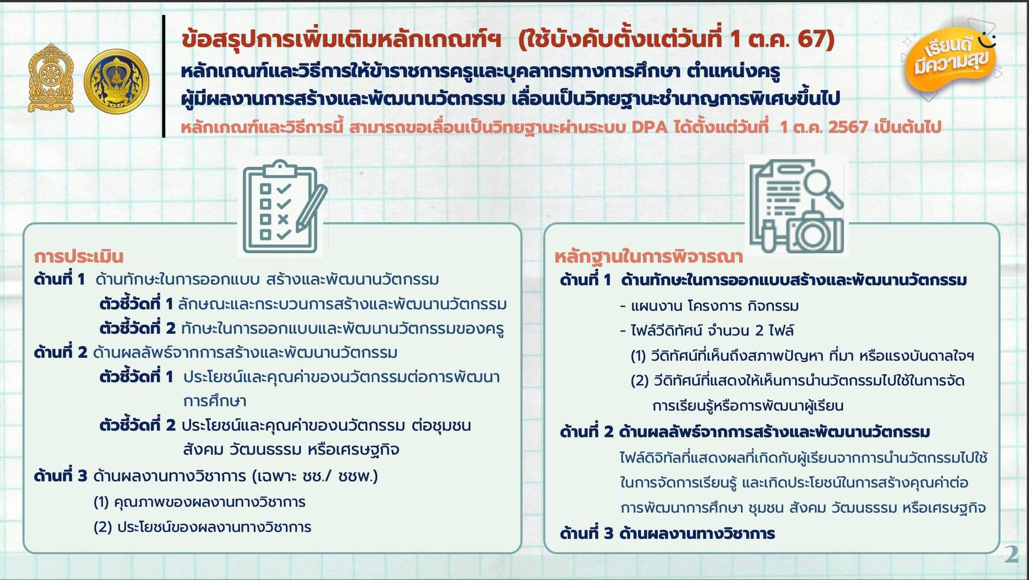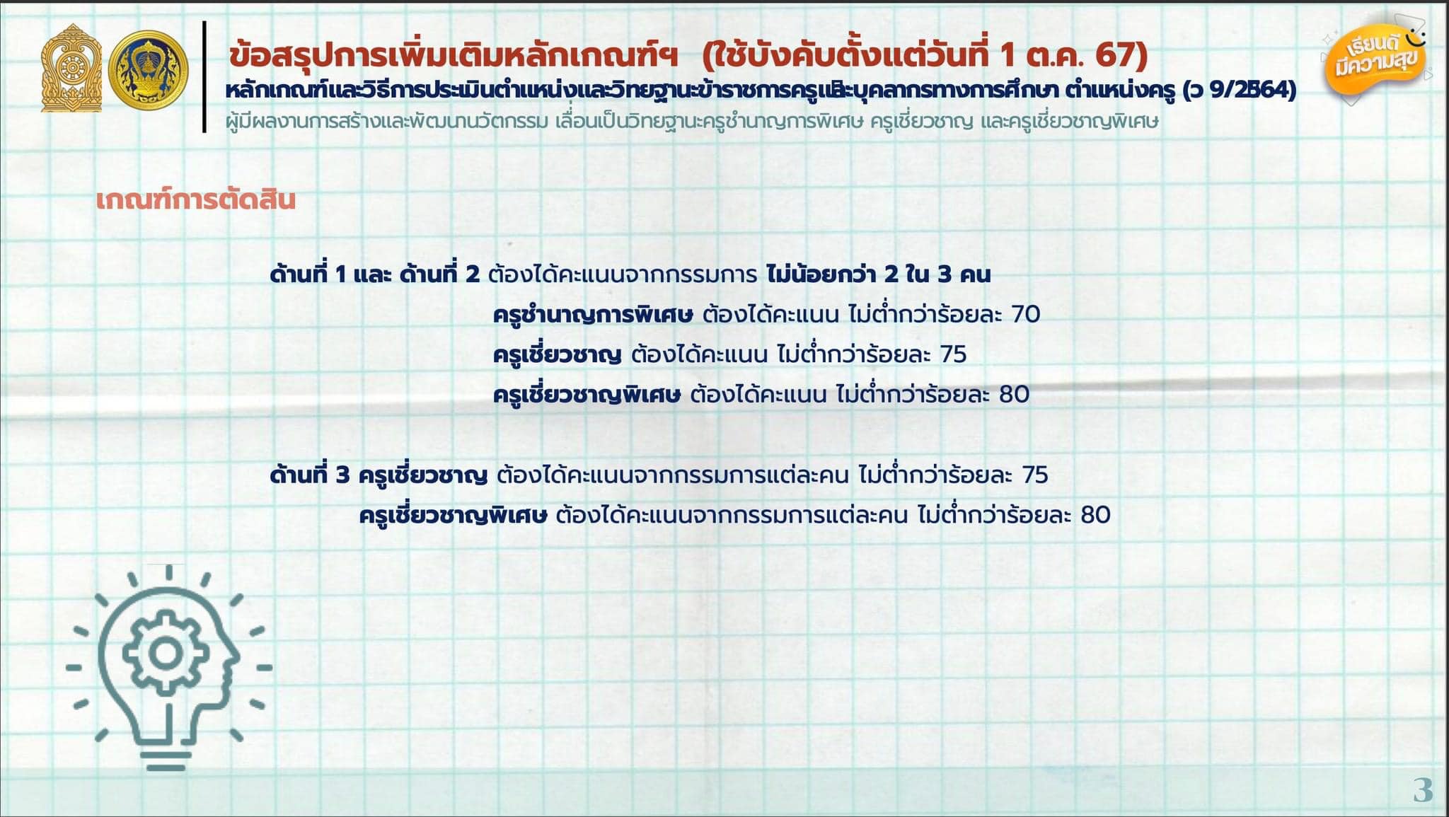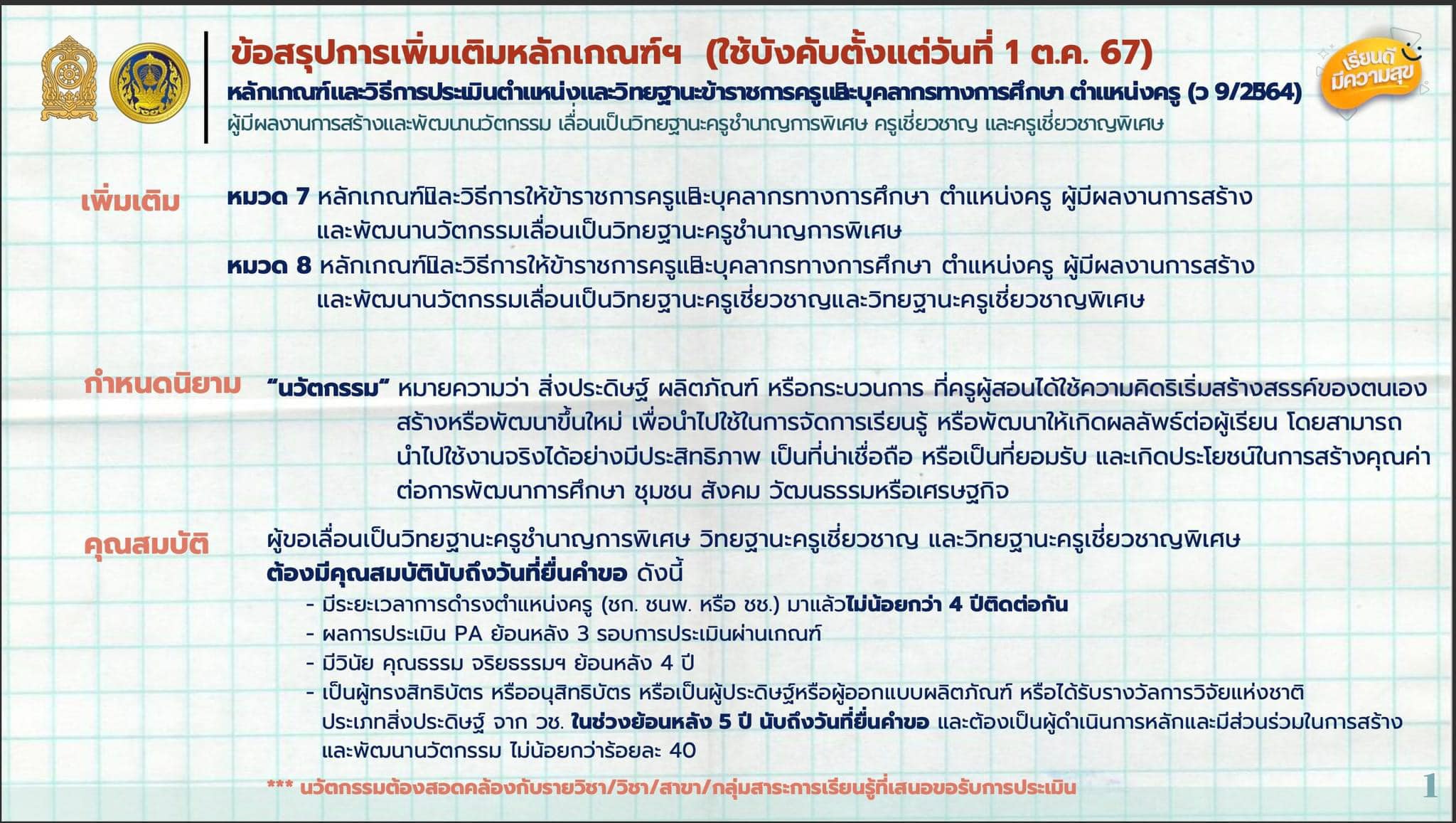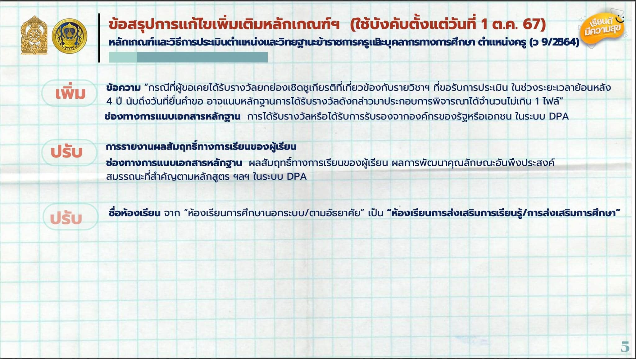 และในการประชุมครั้งนี้ยังได้ข้อสรุปการแก้ไขเพิ่มเติมหลักเกณฑ์และวิธีการประเมินตำแหน่งและวิทยฐานะข้าราชการครูและบุคลากรทางการศึกษา ตำแหน่งครู (ว9/2564) ใช้บังคับตั้งแต่ 1 ตุลาคม 2567