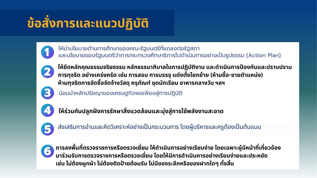 ในการนี้ รมว.ศธ. ได้ให้ข้อสั่งการและแนวปฏิบัติของข้าราชการในการปฏิบัติงาน