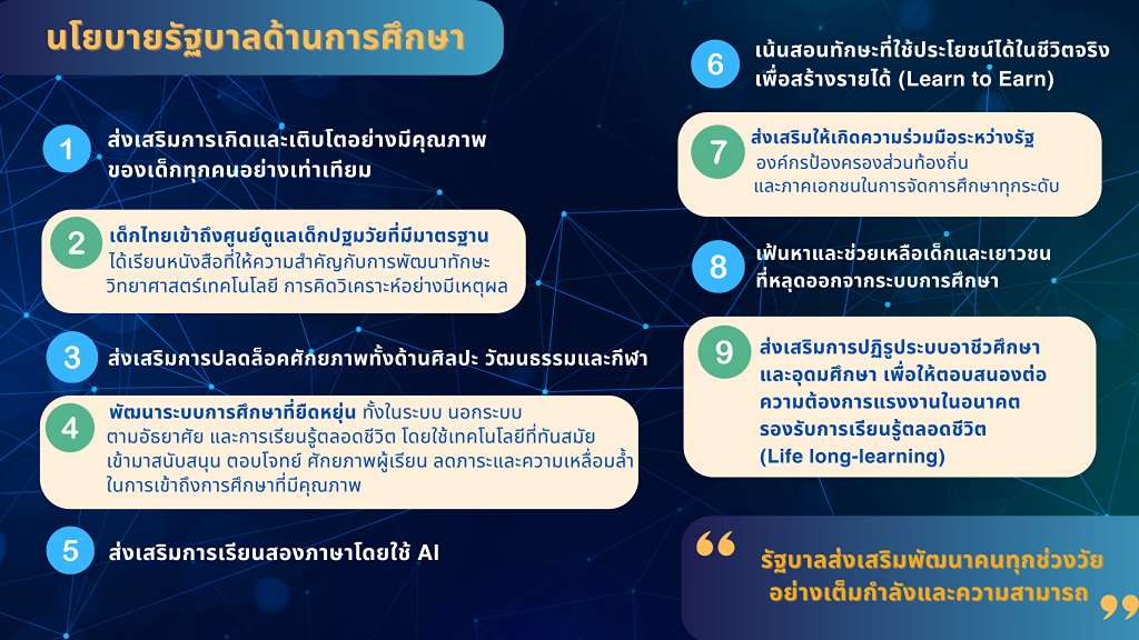 “รัฐบาล” เชื่อว่าทุนมนุษย์เป็นรากฐานที่สำคัญของการพัฒนาประเทศ โดยจะเร่งส่งเสริมผลักดันให้เกิดการพัฒนาคนไทยทุกช่วงวัยอย่างเต็มกำลังและความสามารถ ส่งเสริมการเกิดและเข้าถึงศูนย์ดูแลเด็กปฐมวัยที่มีมาตรฐาน เติบโตอย่างมีคุณภาพ ส่งเสริมการปลดล็อคศักยภาพทั้งทางด้านศิลปะ วัฒนธรรม และกีฬา พร้อมให้ความสำคัญกับการพัฒนาทักษะวิทยาศาสตร์เทคโนโลยี การคิดวิเคราะห์อย่างมีเหตุผล ใช้ปัญญาประดิษฐ์ (AI) ที่ทันสมัยเข้ามาสนับสนุน เพื่อตอบโจทย์ศักยภาพของผู้เรียน ลดภาระ ลดความเหลื่อมล้ำในการเข้าถึงการศึกษาที่มีคุณภาพ เน้นการสอนทักษะที่ใช้ประโยชน์ได้ในชีวิตจริงเพื่อสร้างรายได้ ส่งเสริมให้เกิดความร่วมมือระหว่างรัฐ องค์กรปกครองส่วนท้องถิ่น และภาคเอกชนในการจัดการศึกษาทุกระดับ รวมทั้งการค้นหาและช่วยเหลือเด็กและเยาวชนที่หลุดจากระบบการศึกษา พร้อมส่งเสริมการปฏิรูประบบอาชีวศึกษา และอุดมศึกษา เพื่อให้ตอบสนองต่อความต้องการแรงงานในอนาคต รองรับการเรียนรู้ตลอดชีวิต