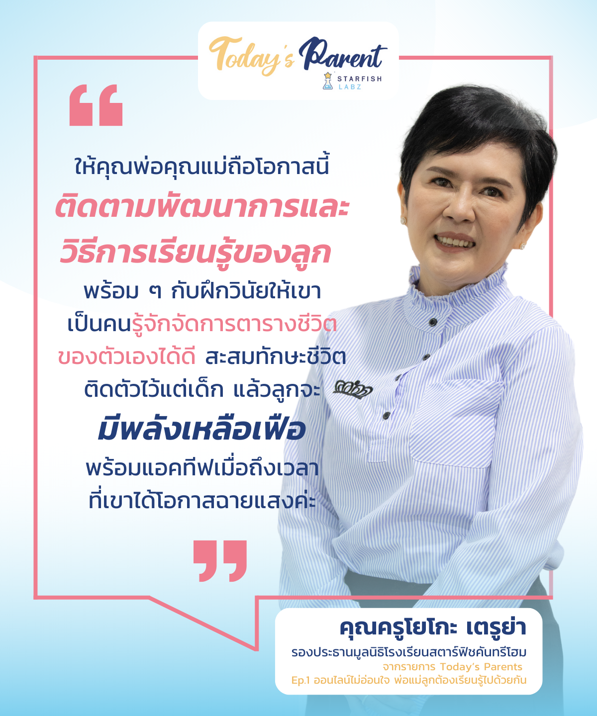 พี่โยมองว่า เราต้องยอมรับเรื่องที่เกิดขึ้น ถือเป็นการปรับตัว สำหรับโลกยุคใหม่ด้วย เพราะว่าโควิดหายไป โรคใหม่ก็อาจจะมาอีก สมัยก่อนคุณพ่อคุณแม่ต้อง ถามคุณครูถึงลูกตน เองจากรั้วด้านนอกโรงเรียน ‘ครูคะลูกเป็นอย่างไรบ้าง’ แต่ตอนนี้ เราได้ดูแลลูกเราเอง
