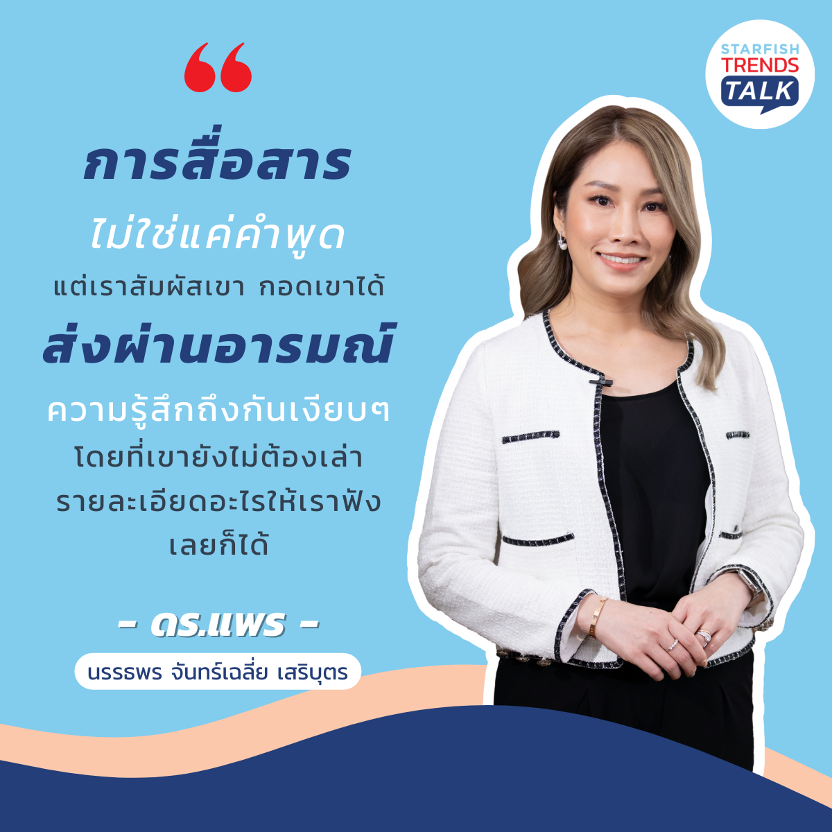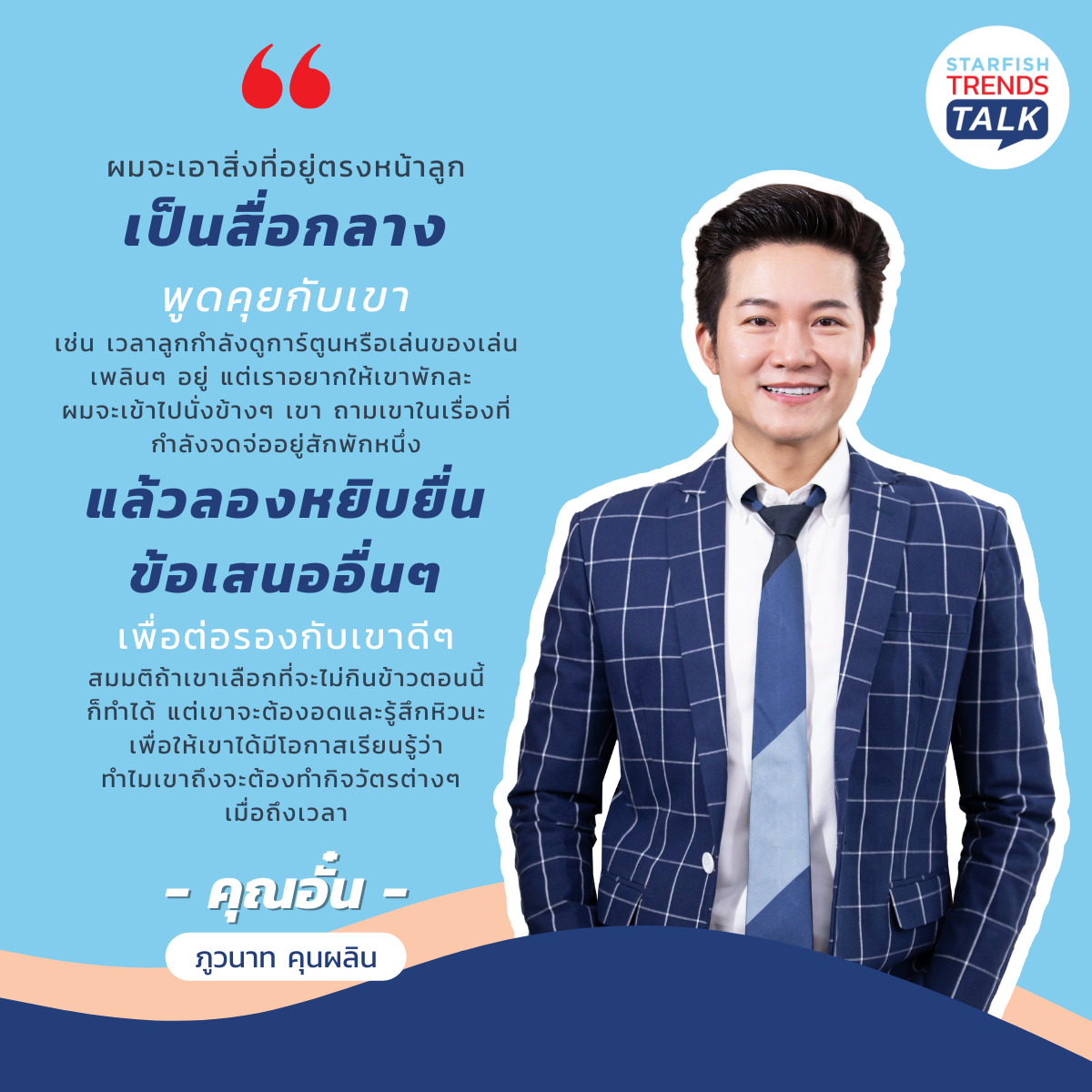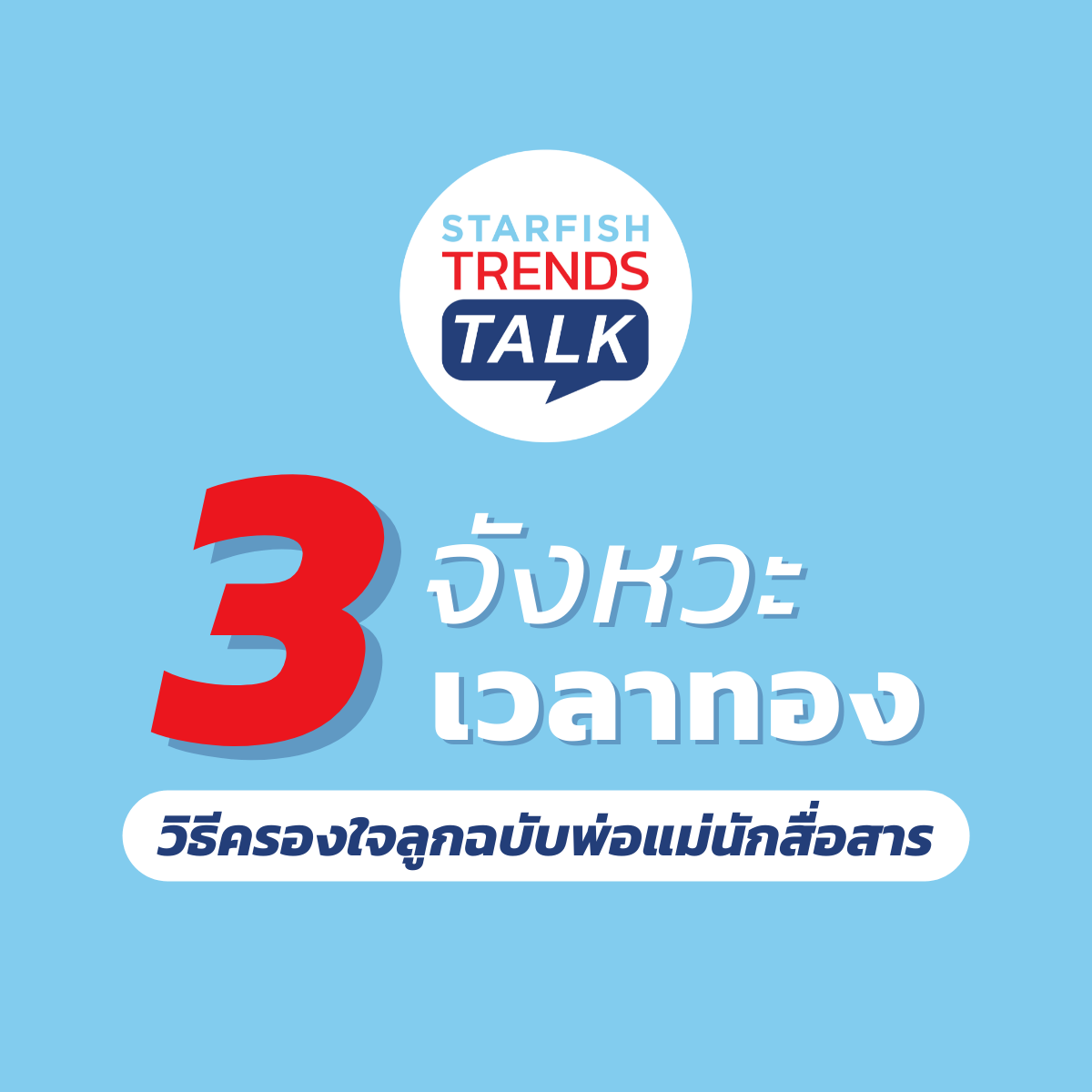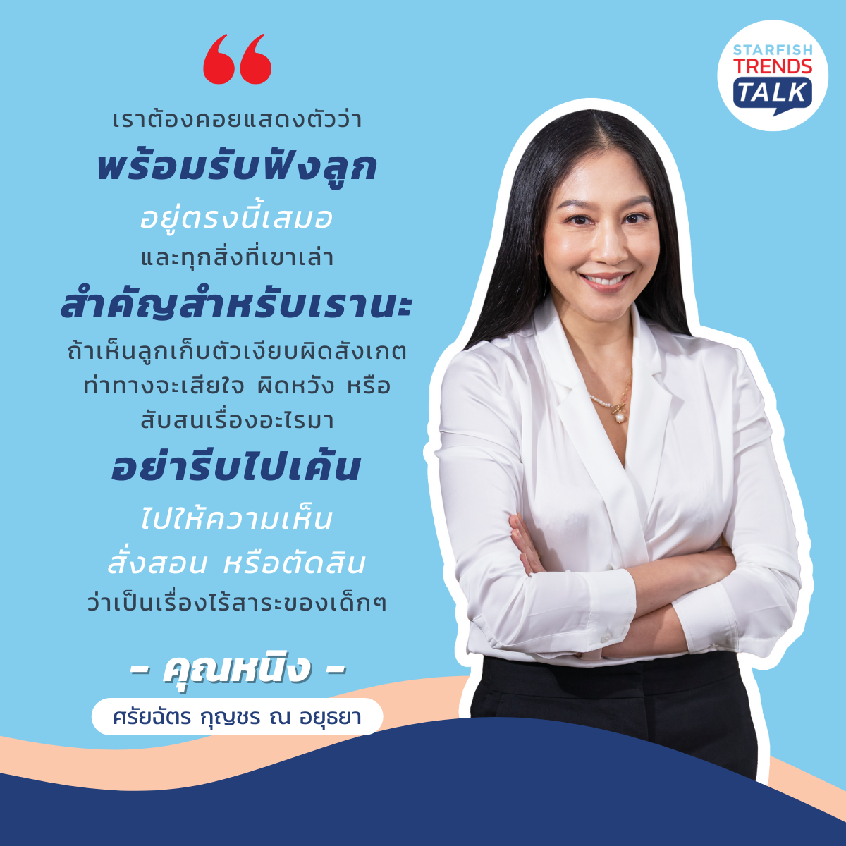 วันนี้ Starfish Labz ชวนแขกรับเชิญชื่อดังอย่าง คุณอั๋น ภูวนาท คุนผลิน และ คุณหนิง ศรัยฉัตร กุญชร ณ อยุธยา พิธีกรมืออาชีพ ผู้เชี่ยวชาญด้านการสื่อสาร ร่วมด้วย Expert ด้านการศึกษา ดร.แพร นรรธพรจันทร์เฉลี่ย เสริบุตร มาตั้งวงเสวนา พูดคุยแลกเปลี่ยนประสบการณ์การเลี้ยงลูกของแต่ละท่านผ่านรายการ Starfish Trends Talk Ep.1 ‘ครู VS พ่อแม่ แท็กทีมสื่อสารอย่างไร? ดีต่อใจเด็ก’ จะมีคำแนะนำดีๆ อะไรบ้าง