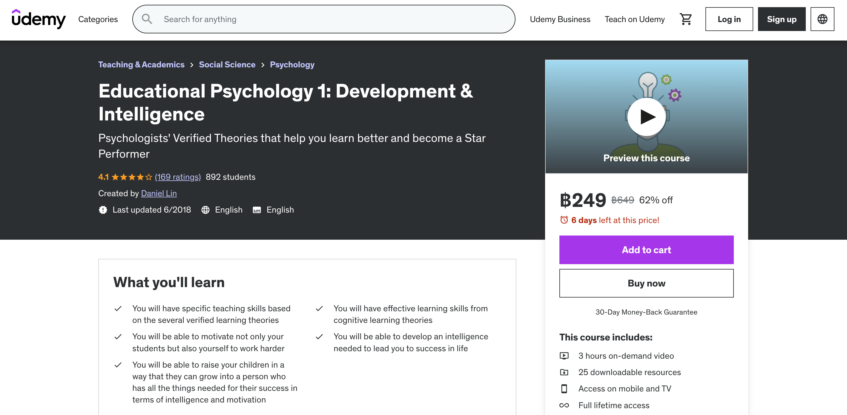 สำหรับแหล่งเรียนรู้สุดท้าย อีกหนึ่งแพลตฟอร์มขนาดใหญ่ระดับโลกที่ต้องแนะนำก็คือ Udemy นั่นเองค่ะ จุดเด่นคือเป็นแพลตฟอร์มขนาดใหญ่มาก มีคอร์สรวมทุกวิชามากกว่า 155,000 คอร์ส และยังสอนโดยอาจารย์จากสถาบันชื่อดังในหลากหลายประเทศ ในหมวดจิตวิทยา มีให้เลือกตั้งแต่ระดับเริ่มต้นจนถึงระดับสูง ราคายังไม่แพง เริ่มต้นที่เพียงแค่ 299 บาทก็มีสำหรับคอร์สเริ่มต้นระยะสั้นๆ