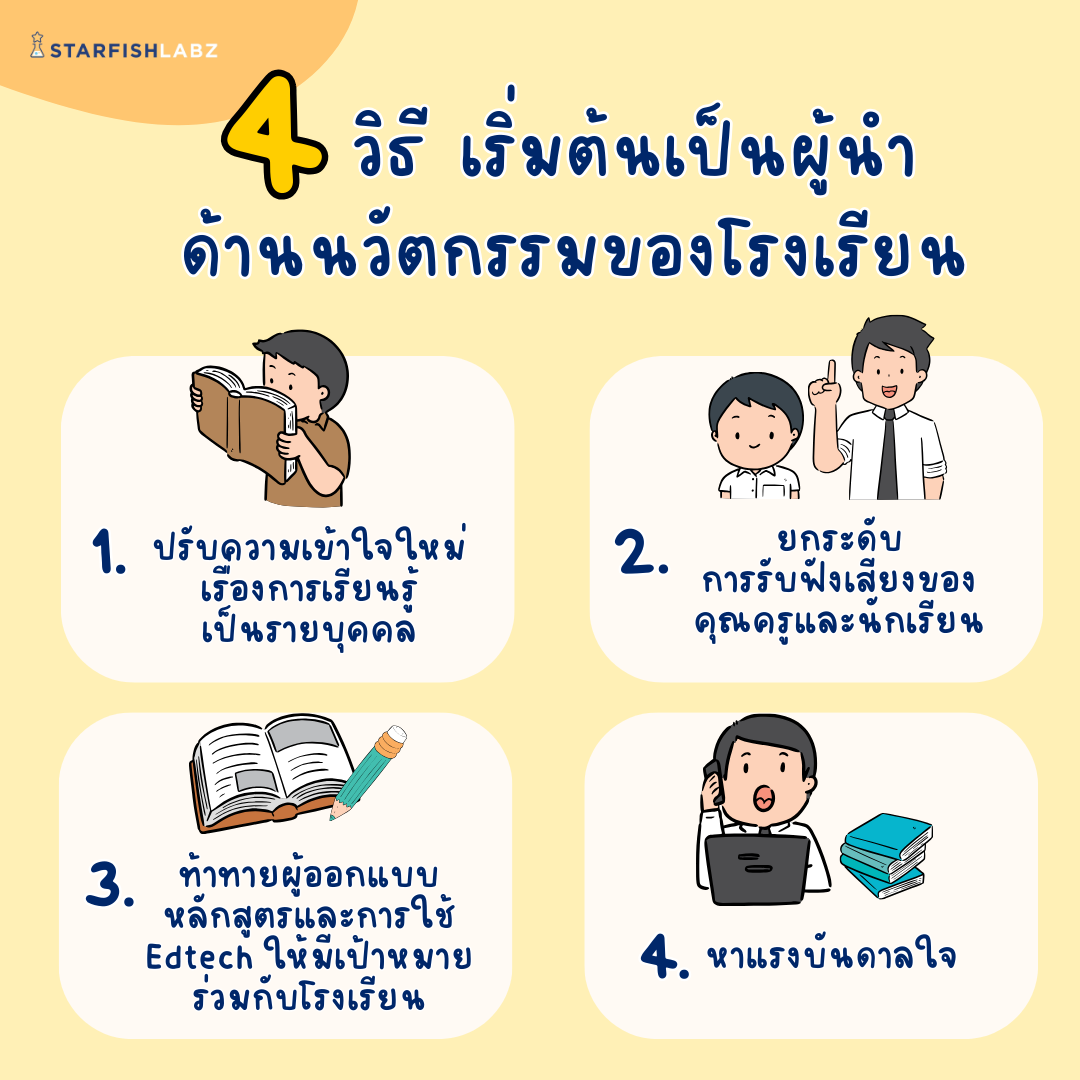 จะเห็นได้ว่า 4 วิธีนี้ เป็นวิธีการพื้นฐาน ที่จะช่วยให้ผู้นำเริ่มคิดถึงบริบทโรงเรียนของตัวเองและคิดถึงการพาโรงเรียนไปสู่โรงเรียนเชิงนวัตกรรมได้นอกจากนี้ Starfish ขอทิ้งท้ายด้วยวิธีการเริ่มต้นง่ายๆ ที่ผู้บริหารอาจจะเริ่มทำได้เลยก็คือการชวนคุณครูมาให้ความหมายของคำว่า “นวัตกรรม” ของโรงเรียนเราคืออะไรและนวัตกรรมนั้นช่วยแก้ปัญหาที่โรงเรียนมีอยู่ได้จริงหรือไม่ และเราจะสร้างนวัตกรรมอะไรใหม่ๆ ขึ้นมาได้อีก เพื่อเป็นการสร้างความเข้าใจที่ตรงกันเบื้องต้นก่อน และหลังจากนั้นค่อยพาไปสู่แนวทางการปฏิบัติจริง