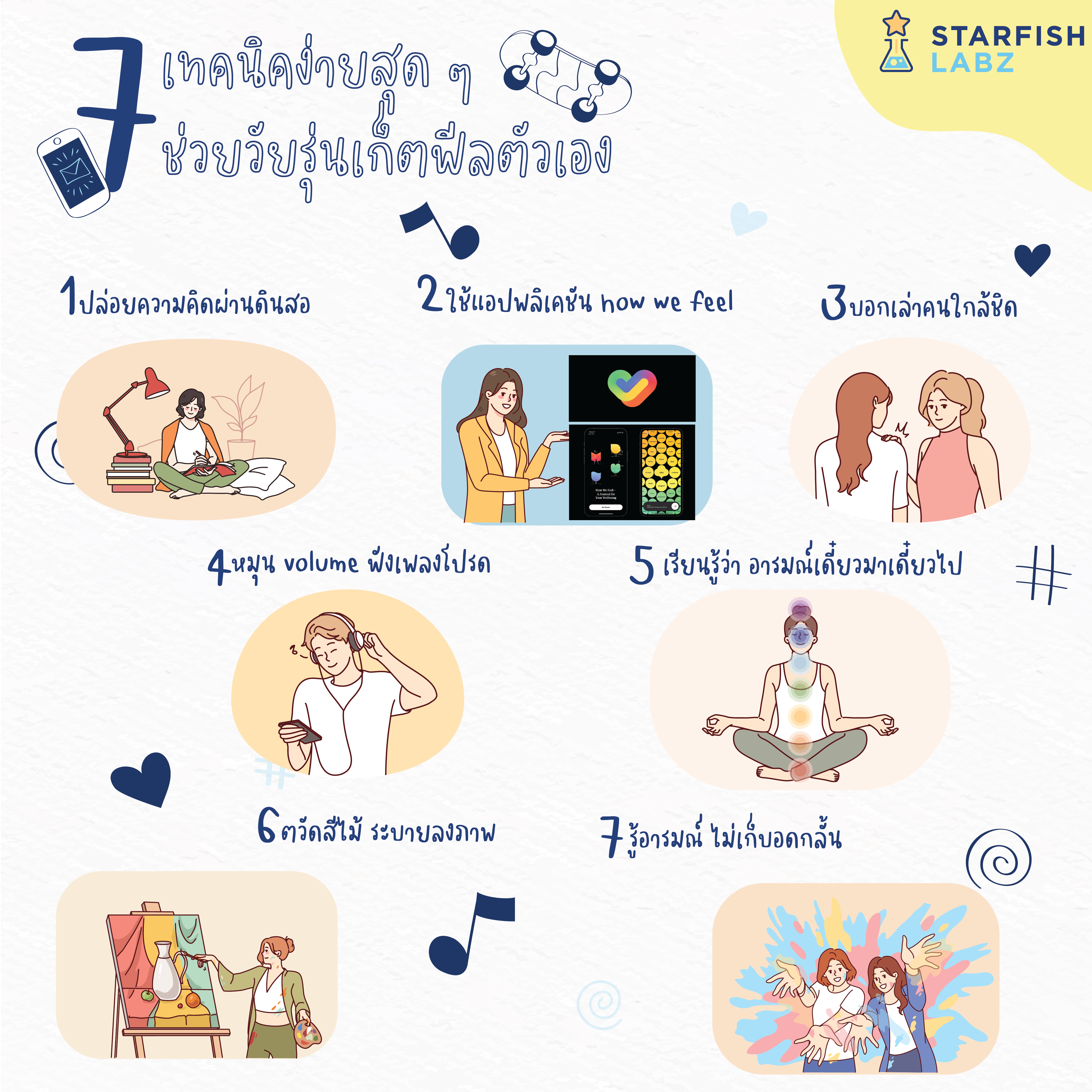 น้อง ๆ เคยเป็นไหมรู้สึกอะไรบางอย่างในใจ อึดอัด ไม่รู้จะอธิบายออกมาเป็นคำพูดแบบไหนดี สุดท้ายคิดวนไปมาก็หาคำตอบไม่เจออีกพี่แนะนำแบบนี้ลองหาที่สงบ และเอนลงบนเก้าอี้หรือโซฟานุ่ม ๆ หลับตา สำรวจดูสิเกิดอะไรขึ้นกับร่างกายบ้าง ส่วนไหนเกร็งตึง ถ้ามีอาการเหล่านี้ ห้ส่งลมหายใจเข้าออก จินตนาการถึงกล้ามเนื้อส่วนนั้นกำลังผ่อนคลาย อันนี้เป็นเทคนิคที่พี่ ๆ ได้มาจากคุณครูสอนโยคะ และมันใช้ได้ผล ตอนที่เรากำลังสับสนวุ่นวายใจซึ่งพี่อยากให้น้องนึกถึงเทคนิคนี้ทุกครั้งที่มีอาการและนอกจากเทคนิคด้านบน พี่ ๆ Starfish Labz ยังมีวิธีอื่นมานำเสนอ เพราะไม่ว่าน้องจะรู้สึกแบบไหนพี่ก็พร้อมจะอยู่ด้วยเสมอ มีอะไรบ้างมาอ่านไปพร้อมกัน