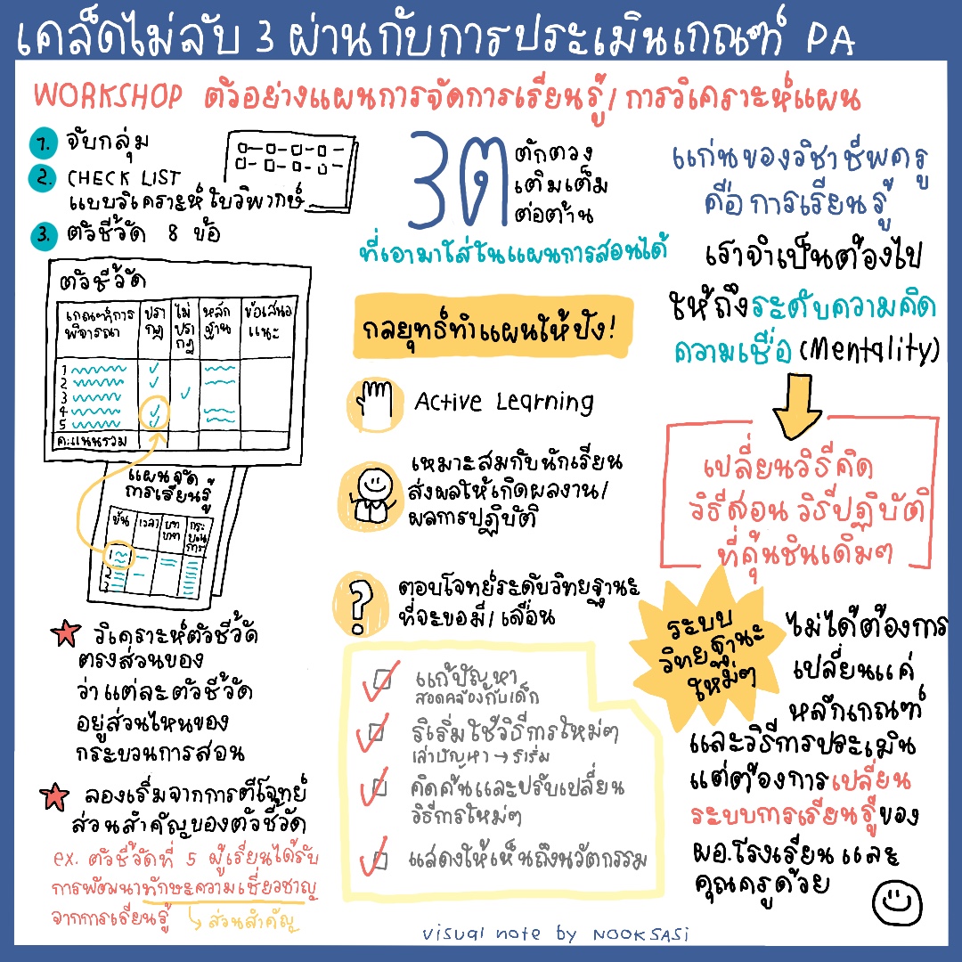 ในหัวข้อกิจกรรมนี้ คุณครูตะวันแสงทอง และคุณครูจักรกฤช ได้นำเคล็ดลับในการ “ผ่าน” การประเมินเกณฑ์ PA มาแลกเปลี่ยนให้คุณครูที่ได้ลงทะเบียนเพื่อรับเทคนิคต่างๆ และนำกลับไปใช้ในการยื่น PA ของตนเองโดยมีทั้งหมด 5 เคล็ดลับ ดังต่อไปนี้