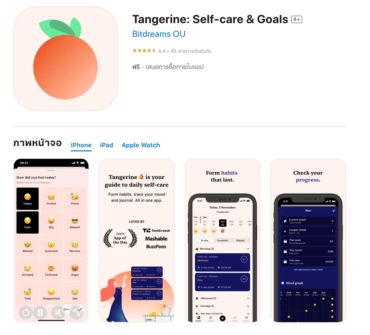 หาก Fabulous ไม่พออีกหนึ่งแอปสำหรับใครที่กำลังมองหาตัวช่วยดูแลเรื่องสภาพจิตใจแบบครบในทุกๆ เรื่องต้องลอง Tangerine ซึ่งมาพร้อมกับหลากหลายส่วนได้แก่การเริ่มต้นการดูแลตัวเองในด้านสภาพจิตใจรวมถึงร่างกาย, การสร้างนิสัย/กิจวัตรที่ดี, การติดตามอารมณ์, การเขียนบันทึก รวมถึงยังมีหน้าการติดตามความก้าวหน้า (Progress) ของเราในการพัฒนาต่างๆ เรียกได้ว่าเป็นแอปรวมวิธีการพัฒนาตนเองแบบฉบับองค์รวมตัวแอปมีความคล้าย Fabulous แต่ก็ยังมีหลากหลายจุดที่แตกต่างกัน อาทิ ของ Tangerine จะมี Journal ด้วย ในขณะที่ของ Fabulous จะเน้นไปที่เรื่องของการสร้าง Habits และ Daily Coaching มากกว่า เรียกได้ว่าใครที่กำลังมองหาแอปคล้ายๆ Fabulous และ Calm รวมกันต้องลองที่ Tangerine เลยค่ะ
