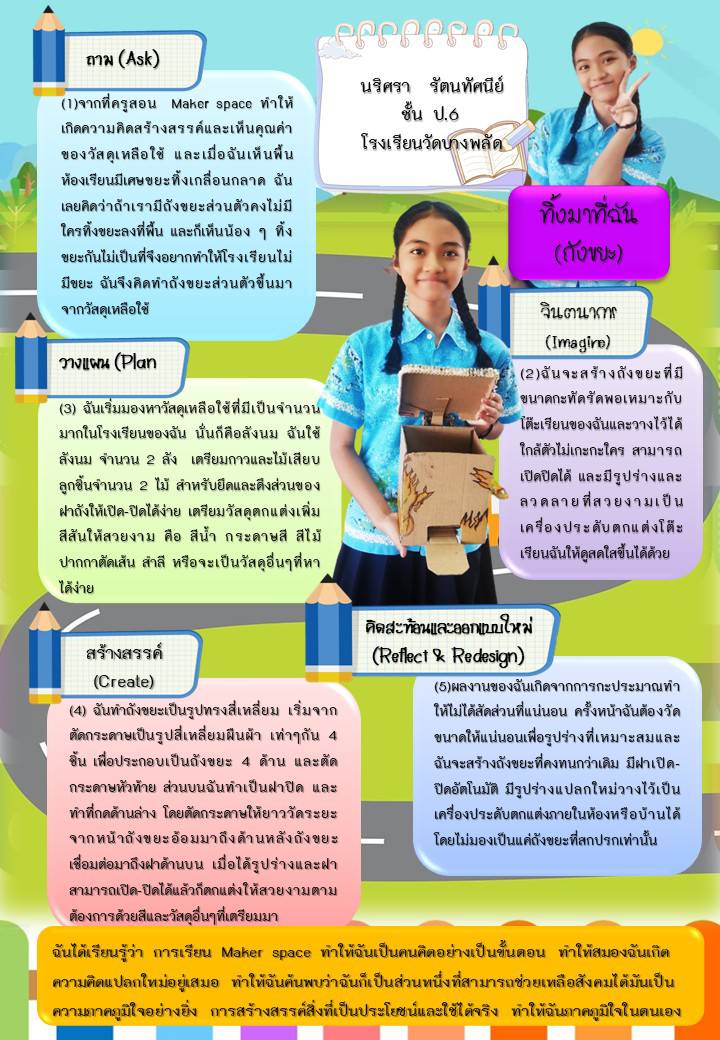แบ่งปันเทคนิคการเรียนรู้ Makerspace ของนักเรียนโรงเรียนวัดบางพลัด ชั้นประถมศึกษาปีที่ 6 โดยใช้กระบวนการ STEAM design Process สร้างสรรค์ผลงานสุดเจ๋งที่ไม่ซ้ำใคร