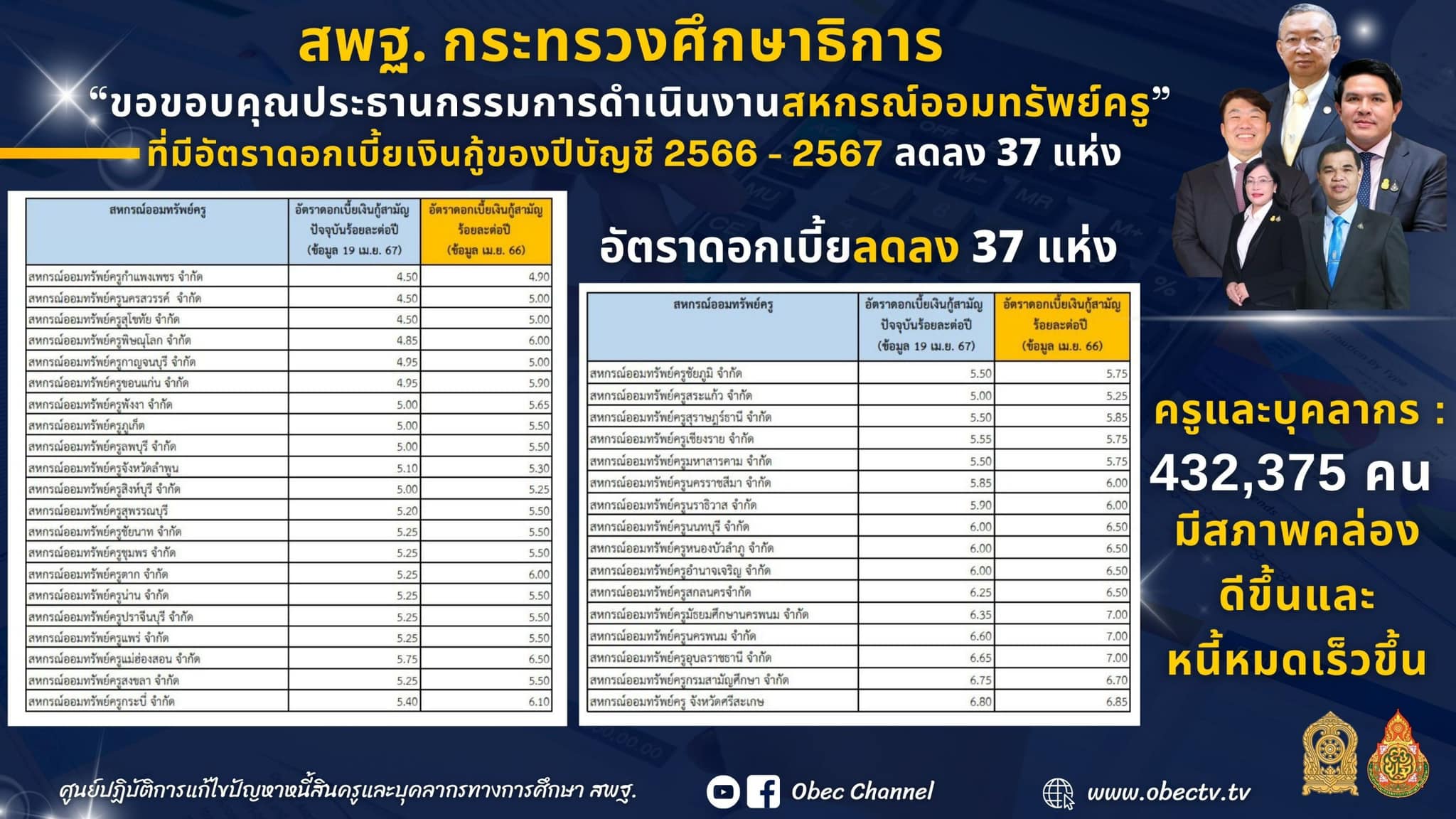 ทำให้ปัจจุบันสามารถแก้ไขหนี้สินให้กับบุคลากร สพฐ. แล้วเสร็จ 680 ราย จากที่ลงทะเบียนไว้ 7,908 ราย มูลค่าหนี้ที่แก้ไขได้รวม 2,040 ล้านบาท ในส่วนความร่วมมือของสหกรณ์ออมทรัพย์ครูที่ผ่านมาในรอบปีบัญชี 2566-2567 มี 37 สหกรณ์ที่เริ่มปรับลดอัตราดอกเบี้ยลงแล้ว ส่งผลให้สมาชิกได้รับโอกาสกว่า 435,000 ราย และในปีบัญชี 2567 มีสหกรณ์ที่สามารถลดดอกเบี้ยได้ไม่เกินร้อยละ 4.75 ซึ่งจะมีผลเริ่ม 1 มิถุนายน 2567 นี้ ปัจจุบันมีการแสดงความจำนงอย่างเป็นทางการแล้ว 10 สหกรณ์ ได้แก่ สอ.กำแพงเพชร สอ.นครศรีธรรมราช สอ.นครสวรรค์ สอ.ประจวบคีรีขันธ์ สอ.พิจิตร สอ.สระบุรี สอ.สุโขทัย สอ.เครือข่ายพัฒนาชีวิตครูแพร่ สอ.อุทัยธานี และ สอ.กาญจนบุรี ซึ่งจะส่งผลให้สมาชิกซึ่งเป็นครูและบุคลากร ทั้งข้าราชการประจำ ลูกจ้าง และข้าราชการบำนาญ กว่า 120,000 คน ได้รับโอกาสที่ดีทำให้ลูกหนี้มีสภาพคล่องทางการเงินดีขึ้น และสามารถผ่อนชำระเงินกู้ให้หมดเงินงวดได้โดยเร็วขึ้น