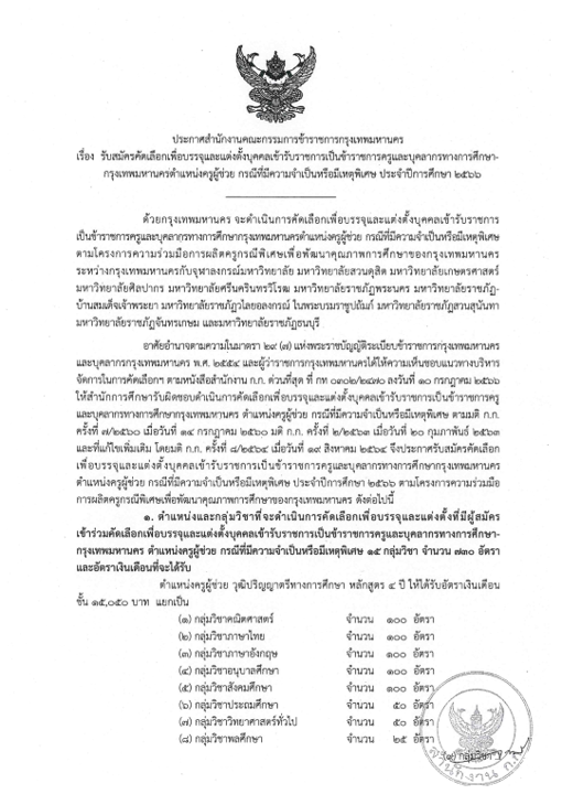 ด้วยกรุงเทพมหานคร จะดำเนินการคัดเลือกเพื่อบรรจุและแต่งตั้งบุคคลเข้ารับราชการเป็นข้าราชการครูและบุคลากรทางการศึกษากรุงเทพมหานคร ตำแหน่งครูผู้ช่วย กรณีที่มีความจำเป็นหรือมีเหตุพิเศษ ตามโครงการความร่วมมือการผลิตครูกรณีพิเศษเพื่อพัฒนาคุณภาพการศึกษาของกรุงเทพมหานคร ระหว่างกรุงเทพมหานครกับจุฬาลงกรณ์มหาวิทยาลัย มหาวิทยาลัยสวนดุสิต มหาวิทยาลัยเกษตรศาสตร์ มหาวิทยาลัยศิลปากร มหาวิทยาลัยศรีนครินทรวิโรฒ มหาวิทยาลัยราชภัฏพระนคร มหาวิทยาลัยราชภัฏบ้านสมเด็จเจ้าพระยา มหาวิทยาลัยราชภัฏวไลยอลงกรณ์ ในพระบรมราชูปถัมภ์ มหาวิทยาลัยราชภัฏสวนสุนันทา มหาวิทยาลัยราชภัฏจันทรเกษม และมหาวิทยาลัยราชภัฏธนบุรี